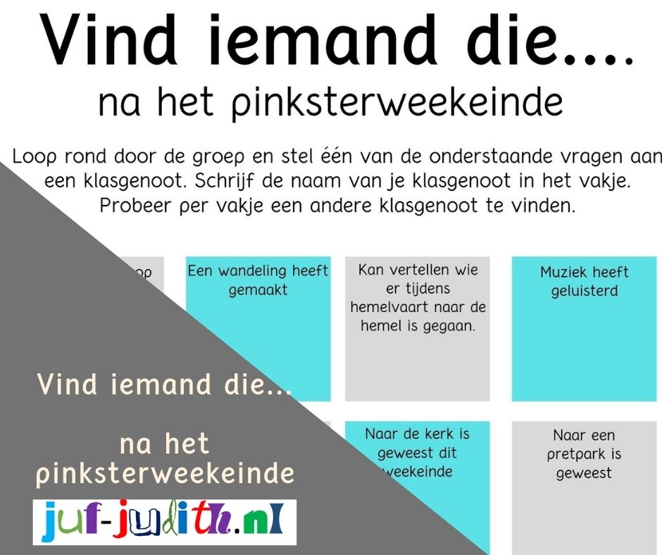 Vind iemand die is een werkvorm die regelmatig wordt gebruikt. Vaak is deze werkvorm een leuke starter of energizer. Deze werkvorm kun je goed inzetten om de leerlingen, binnen jouw kader, te laten praten over het pinksterweekeinde