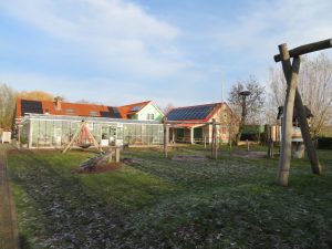 In de tuinkas, waar je normaal je eigen zaadjes kunt planten, kun je nu knutselen. In de sinterklaastijd is dit een mooie pietenmuts of mijter, maar ik heb begrepen dat er na de Sinterklaastijd een pindaslinger gemaakt kan worden voor de vogeltjes.